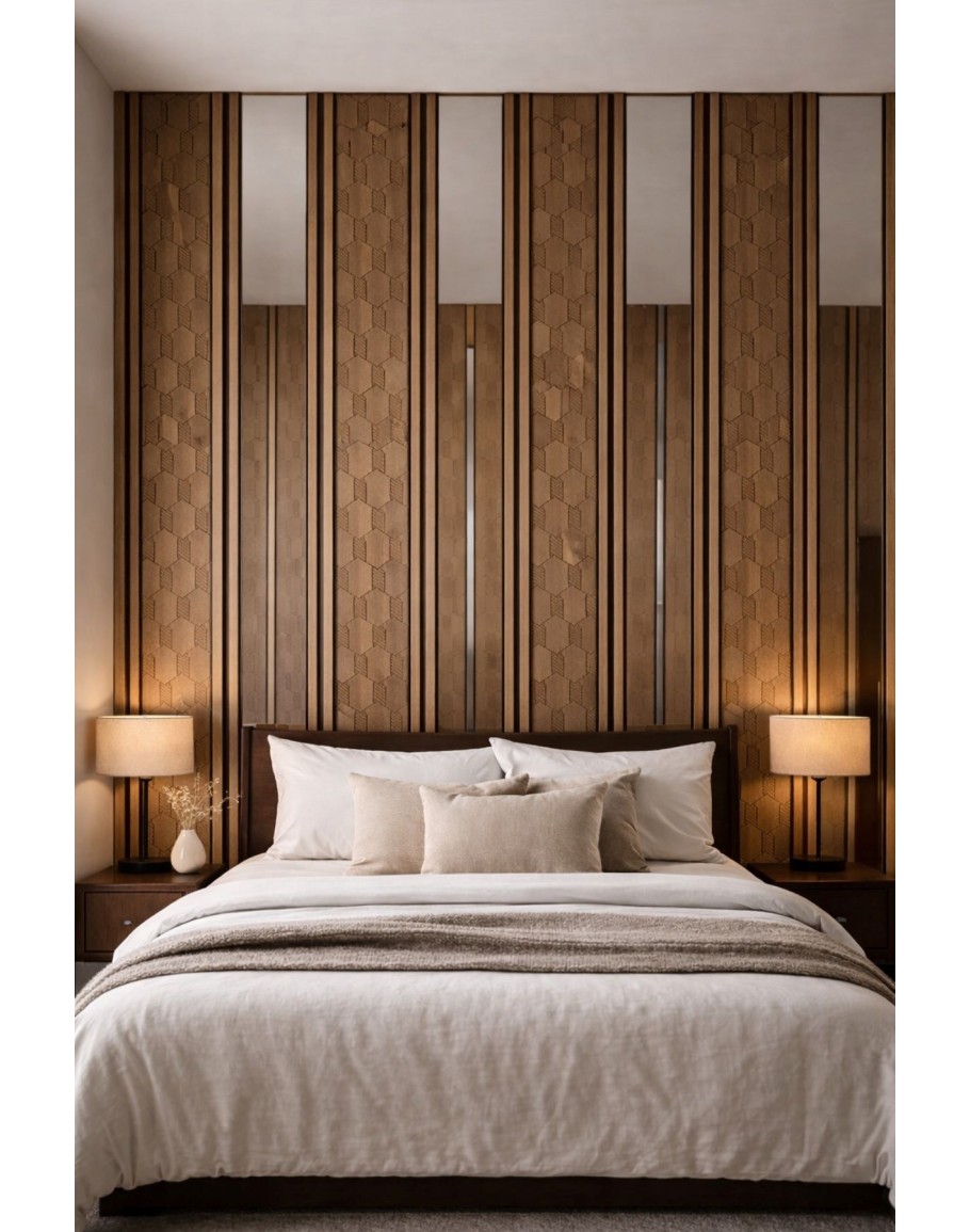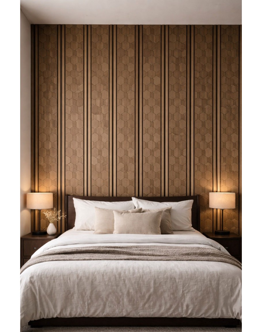 Елегантни декоративни панели с геометричен релеф и дървесен ефект, подходящи за акцентни стени в домове, офиси, хотели и търговски пространства.