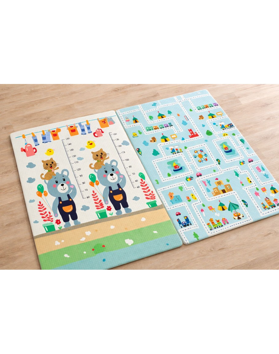 Двулицевият дизайн стимулира детското въображението чрез цветни илюстрации с градски и природни сюжети. Най-малките, тепърва прохождащи деца, могат да следват нарисуваните улици, което тренира тяхната координация и баланс. Формата на килимчето е достатъчно просторна, за да позволи спокойно движение, пълзене и седене на най-малко две деца едновременно.