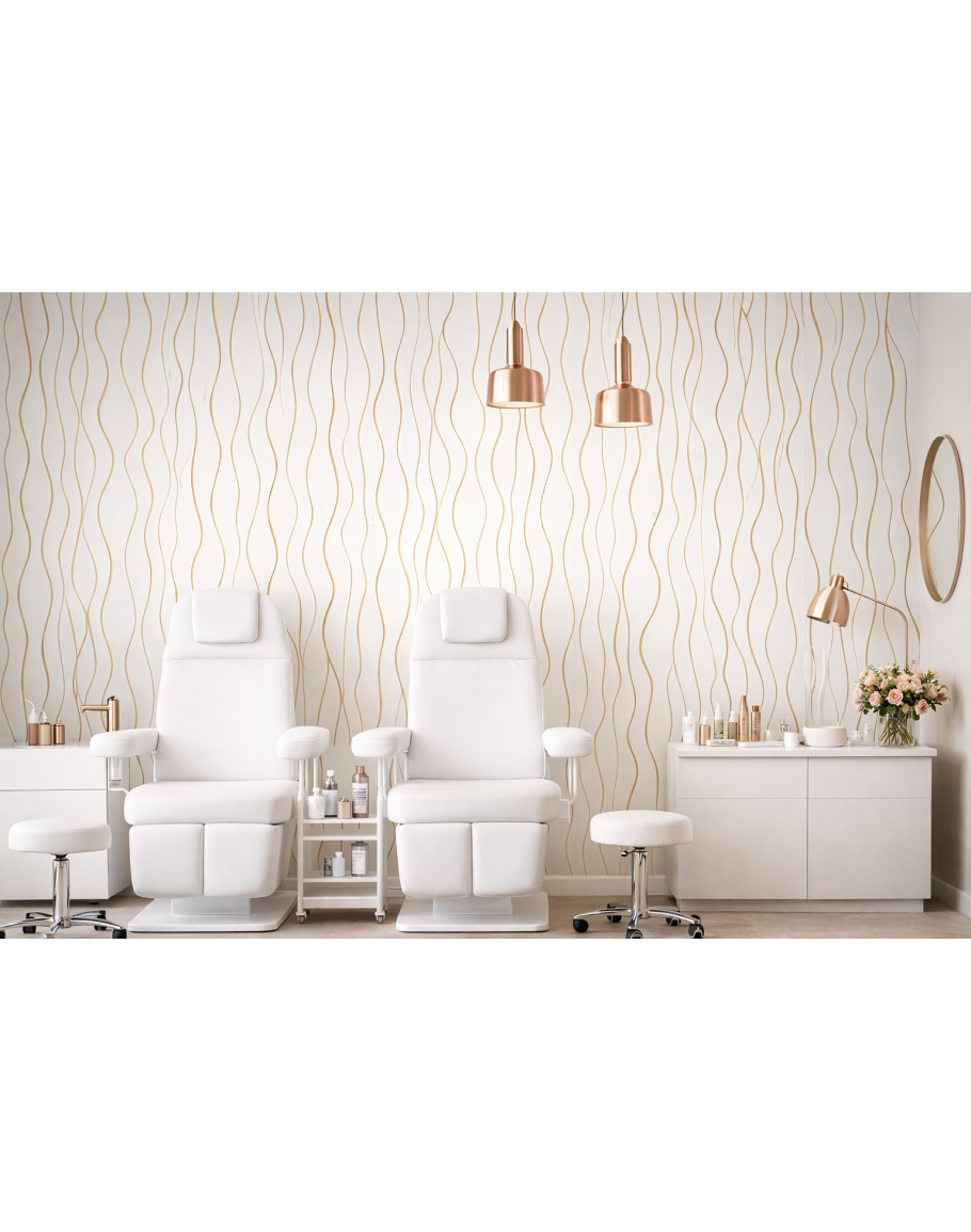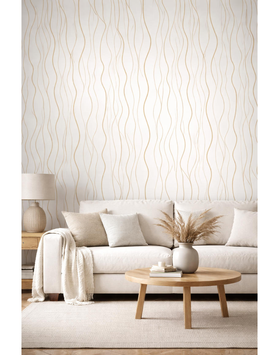 Дизайнът на тапета е изискан и ненатрапчив. Принтът съчетава мек кремав цвят с нежни вълнообразни линии във вертикална посока. Вертикалните шарки придават на стаята динамика и изящество, като едновременно удължават визуално стената и карат пространството да изглежда по-високо и светло.